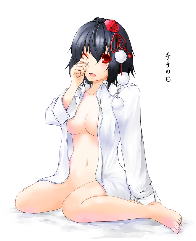 1girlbarefootblack hairbottomlessbreastsdress shirtfeetfemale focushatlooking at viewernaked shirtno pantiesone eye closedopen clothesopen mouthopen shirtred eyesshirtshort hairsittingsolotokin hatwarizawink