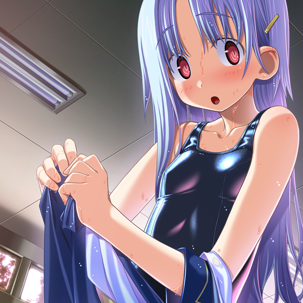 :o1girlblue hairblushfemale focusflat chesthair ornamenthaircliplong hairone-piece swimsuitopen mouthpink eyesschool swimsuitsoloswimsuitundressingwet
