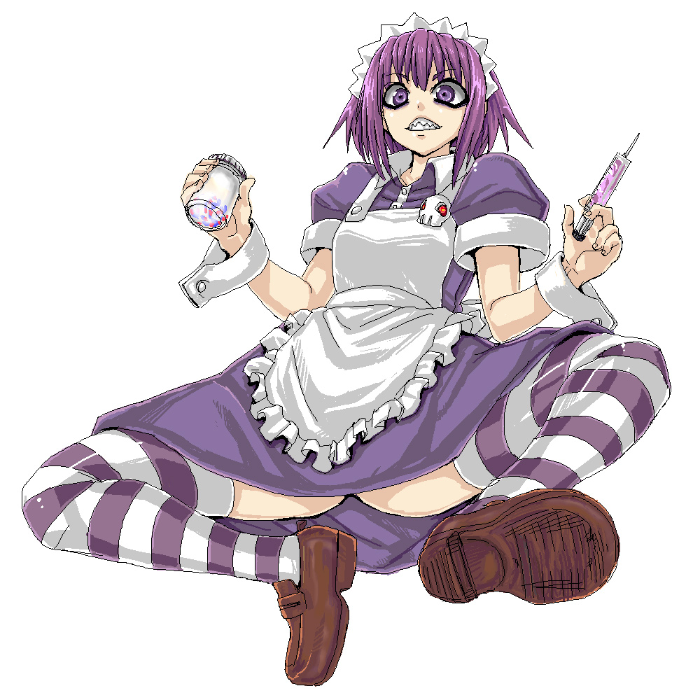 1girlaproncrazy eyesdrugsfemale focusjaggy linesmaidmaid apronoekakipurple eyespurple hairsalivashort hairsolostriped clothesstriped thighhighssyringethighhighs
