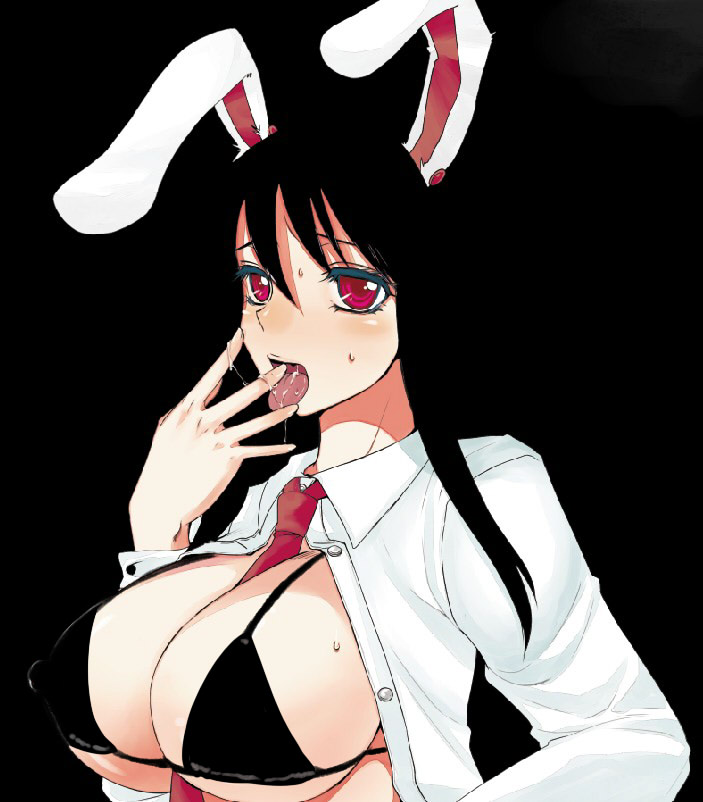 1girlalternate coloralternate hair coloranimal earsbetween breastsbikinibikini top onlyblack hairbrabreastscleavagefemale focushuge breastslickinglicking fingerlong hairnecktieopen clothesopen shirtrabbit earsred eyesshirtsoloswimsuittongueunderboobunderwearupper body