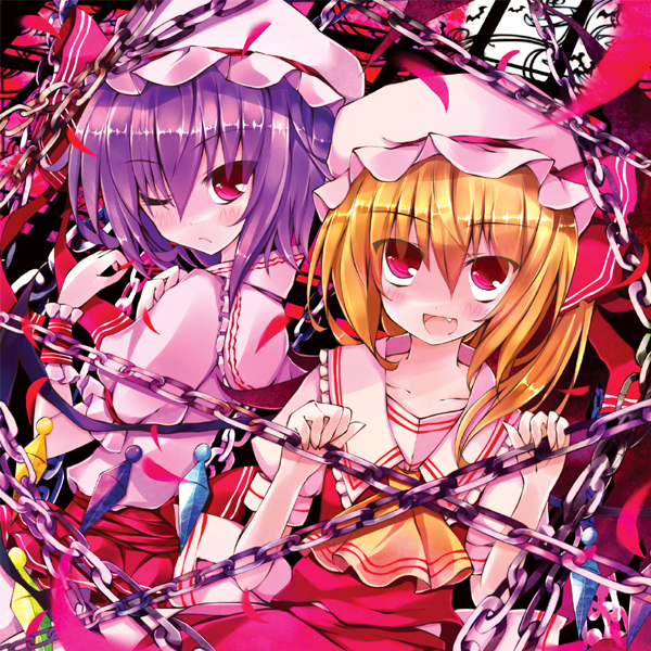 2girlsblonde hairchainfangfemale focushatmultiple girlsone eye closedpurple hairred eyesshort hairsiblingsside ponytailsisterswingswinkwrist cuffs