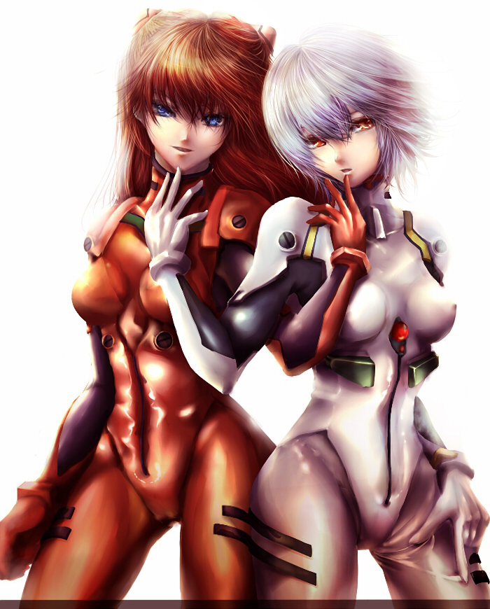 2girlsblue eyesblue hairlong hairmecha pilot suitmultiple girlsplugsuit (evangelion)red eyesred hairshort hairsmile