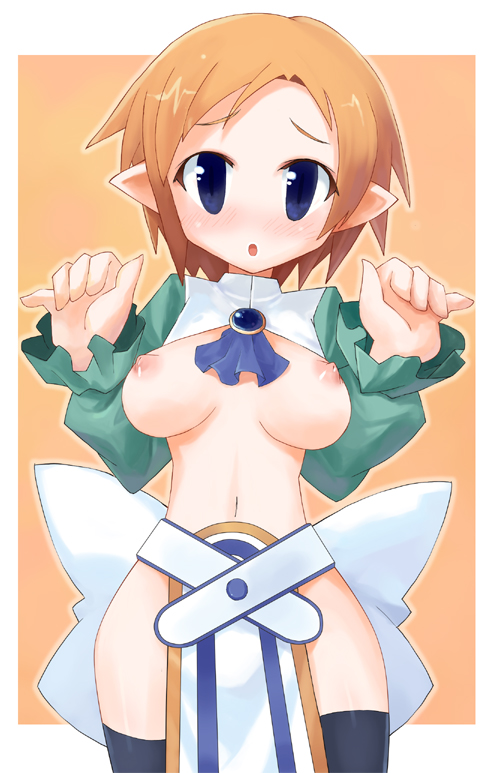:o1girlascotbeltblack thighhighsblue eyesblushbowbreastsembarrassedfemale focusgemgreen shirtlarge breastsloinclothlooking at viewermidriffnaked tabardnavelnecktienipplesno brano pantiesopen clothesopen shirtorange hairpointy earspuffy nipplesshirtshort hairsolostandingsurprisedtabardthighhighsturtleneck