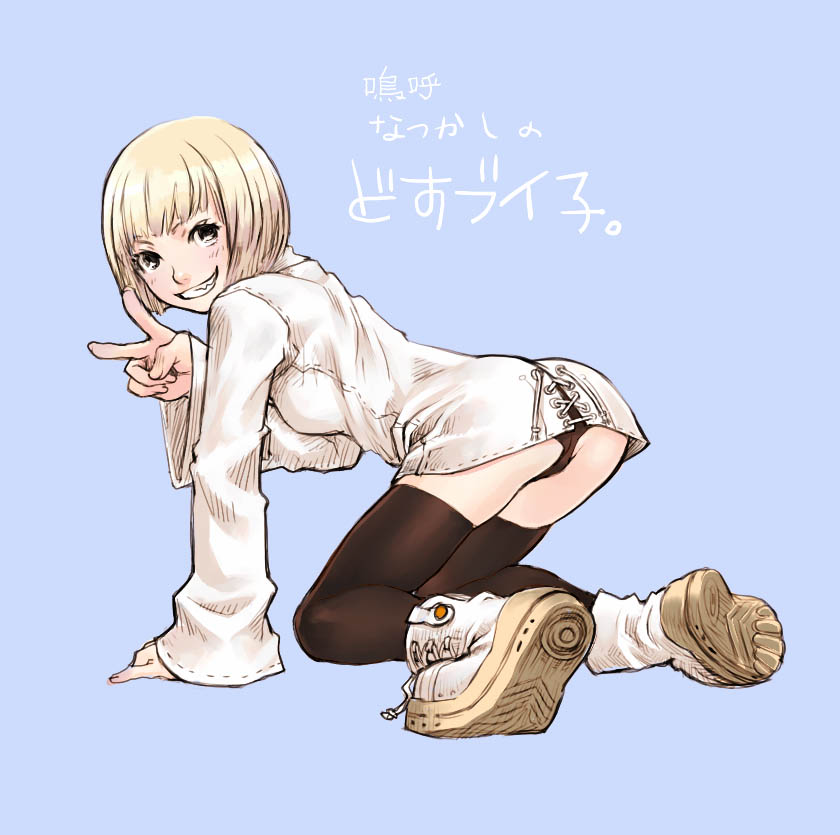 1girlarm supportassblack pantiesblack thighhighsblonde hairblue backgroundbob cutbootsbreastsdress shirtfemale focusgrinpantiesshirtshort hairsimple backgroundsmilesolothighhighsunderwearvwhite boots