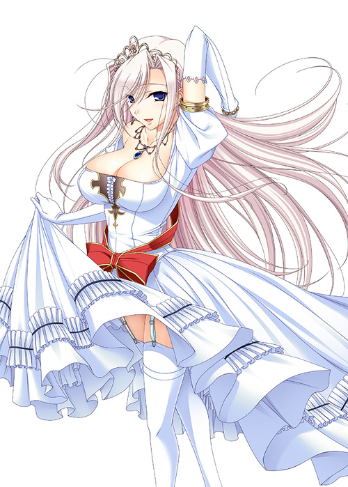 1girlblue eyesbreastscleavageclothes liftdressdress liftelbow glovesfemale focusglovesjewelrylarge breastslong hairnecklacepink hairskirtskirt holdskirt liftsmilesolothighhighstiarawhite backgroundwhite gloveswhite thighhighs