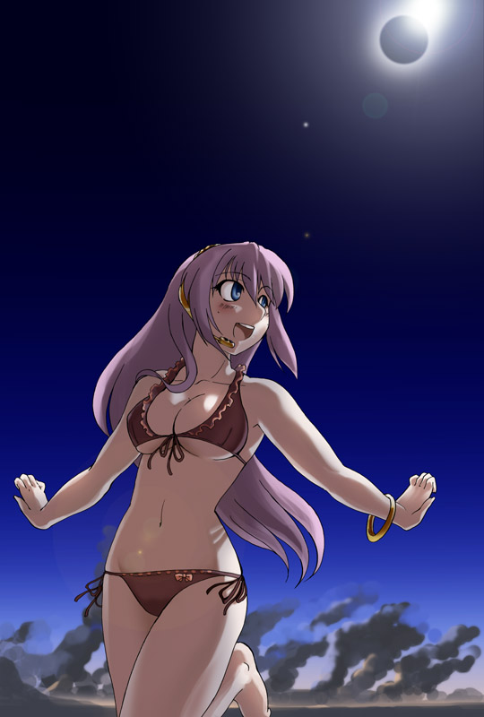 1girlbikiniblue eyesbraceleteclipsefemale focusfront-tie topheadsetjewelrylens flarelong hairmicrophonepink hairside-tie bikini bottomsolar eclipsesoloswimsuit