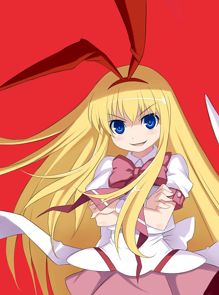 00s1girlblue eyesbowbowtiecrossed armsevil smilefemale focusgloveshead tiltlong hairlooking at viewerpuffy short sleevespuffy sleevesred backgroundred bowred bowtieshaded faceshort sleevessimple backgroundsmilesolowhite gloves