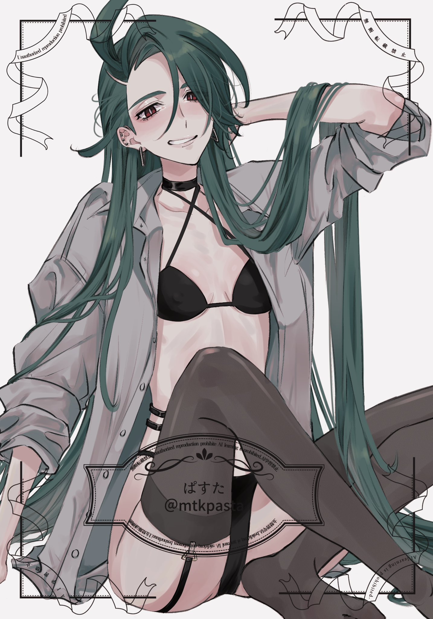 1girlarm behind headartist nameblousechokercollarboneearringsfemale focusflat chestgarter strapsgreen hairjewelrylight blushlingerielong hairlooking at vieweropen clothesred eyesshirtskinnyteethtwitter usernameunderwearvery long hair