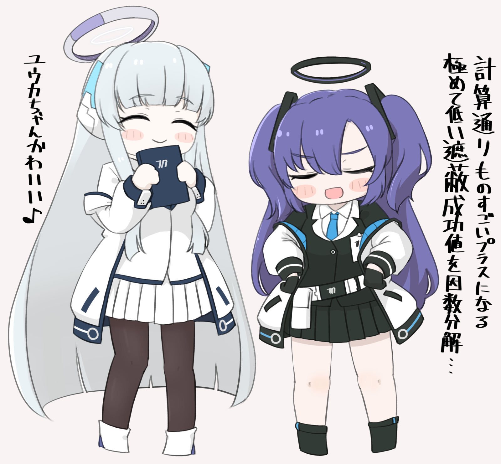 :d2girlsblack bootsblack jacketblack skirtblue necktieblush stickersbootsbrown pantyhoseclosed eyesclosed mouthcollared shirtgrey backgroundgrey hairhair between eyeshalohands upheadgearholdingjacketlong hairmultiple girlsnecktieopen mouthpantyhoseparted bangspleated skirtpurple hairshirtsimple backgroundskirtsmiletwo side upvery long hairwhite bootswhite jacketwhite shirtwhite skirt