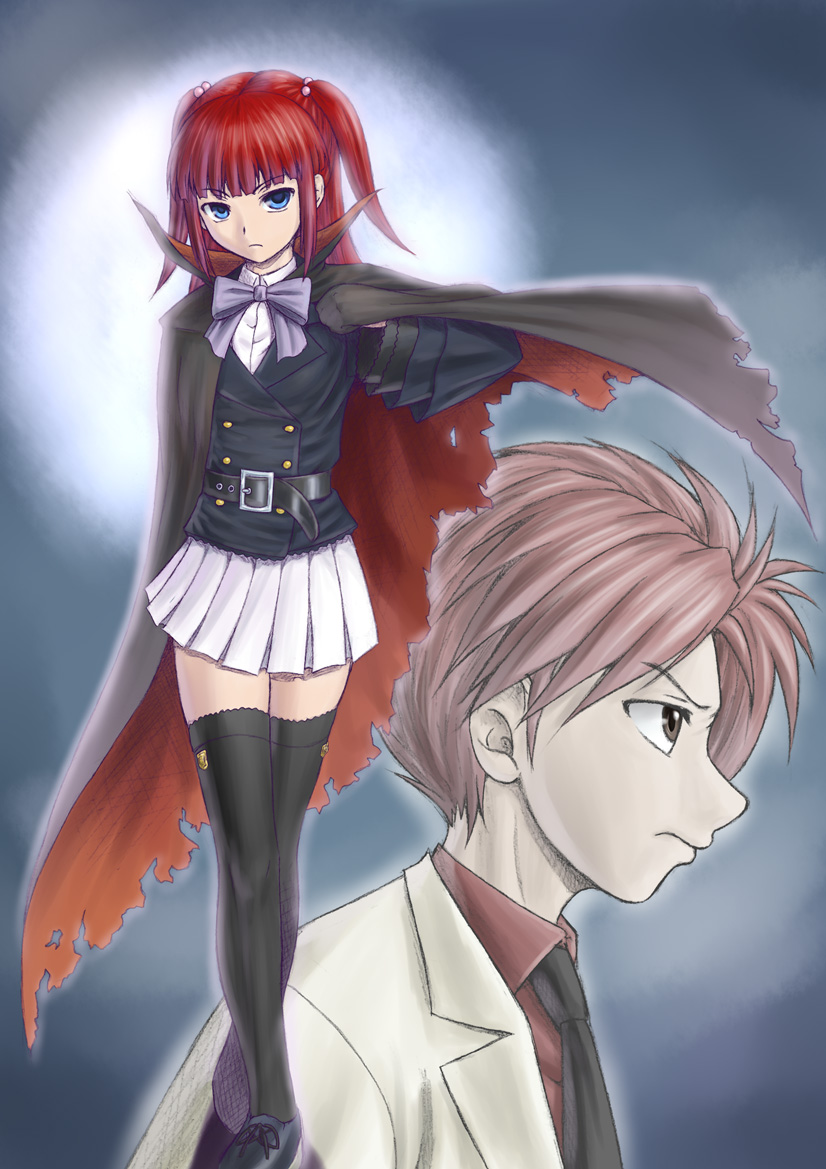 00sarmbandblue eyesbowbrother and sistercapehair bobbleshair ornamentjacketred hairsiblingsskirtthighhighstorn capetorn clotheszettai ryouiki