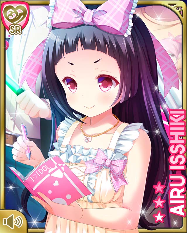 1boy1girlblunt bangsbowbreastsbrown haircamisolecard (medium)character namefrilled camisolefrillshair bowholdingholding notepadholding penjewelrylarge breastslong hairnecklacenotepadpenpink bowplaid bowred eyesshortssmilesolov-shaped eyebrowswhite camisole