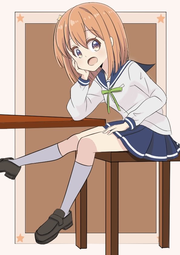1girlblue sailor collarblue skirtchairfemale focushair between eyeshair ornamenthand on own facelong sleeveslooking at viewermedium hairmulticolored eyesopen mouthorange hairribbonsailor collarschool uniformserafukushirtshoessittingskirtsockssolostar (symbol)star hair ornamenttablewhite shirtwhite socks