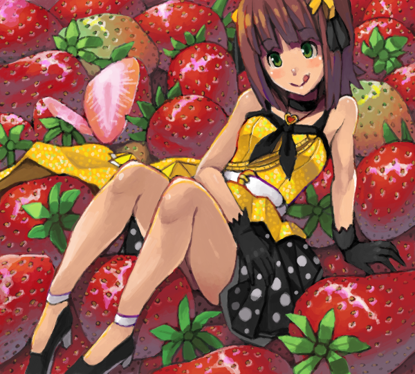 :p:q00s1girlbare shouldersbob cutbrown hairdrawrfemale focusfoodfruitgreen eyeshair ribbonoekakiribbonsittingsolostrawberrytonguetongue out