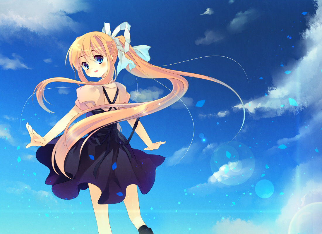 00s1girlblonde hairblue eyesblushfemale focuslens flarelight smilelong hairlooking backoutstretched armsoutstretched handponytailribbonsolospread armsvery long hair