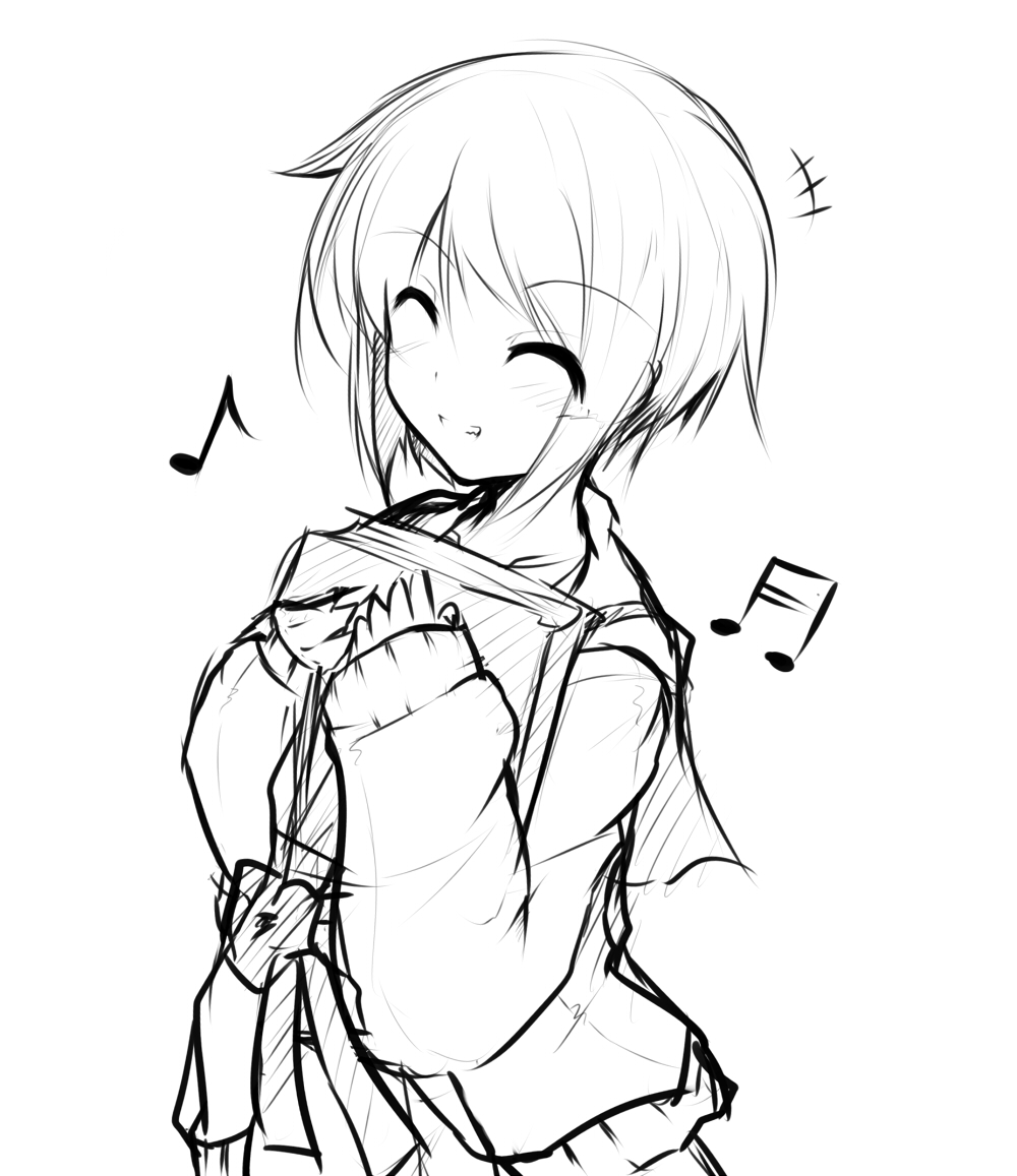 00s1girlbookcardiganfemale focusgreyscalegrinhappylong sleevesmonochromemusical noteout of characterschool uniformserafukushort hairsketchsleeves past wristssmilesolo