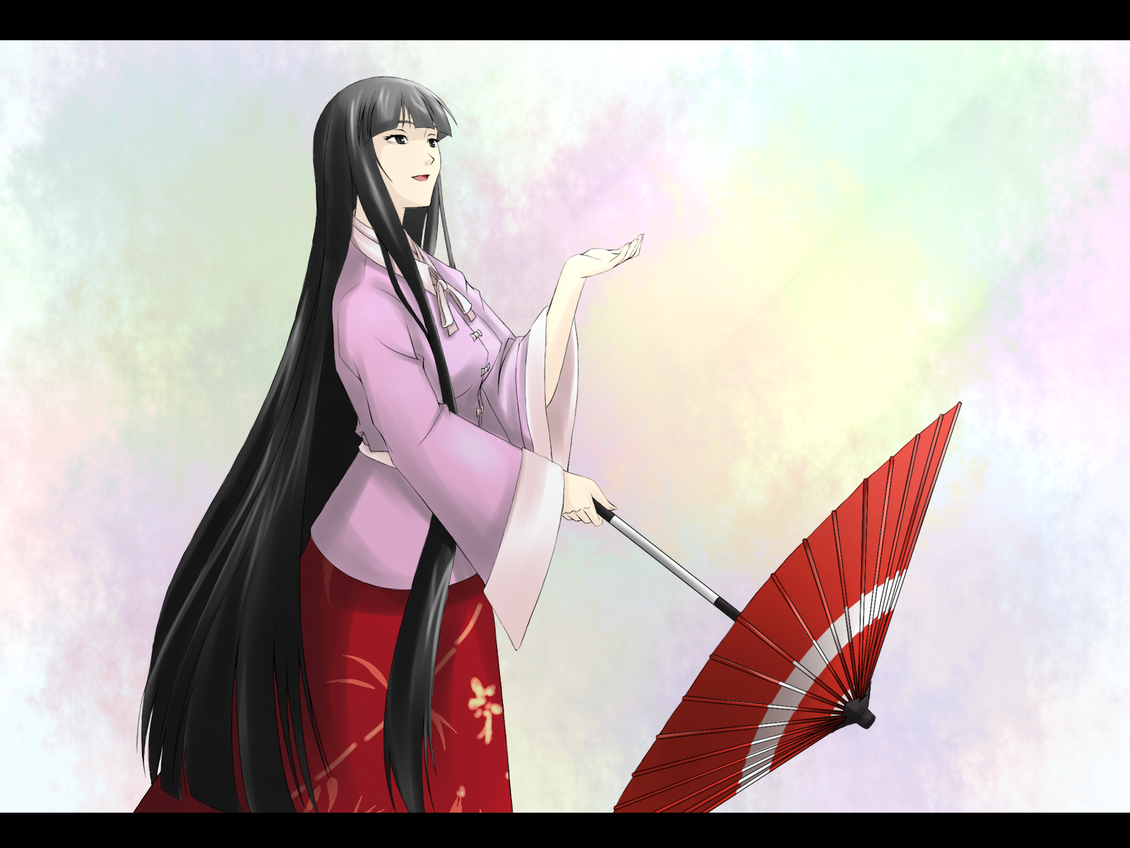 1girlblack hairfemale focusjapanese clotheskimonoletterboxedlong hairoil-paper umbrellasoloumbrella