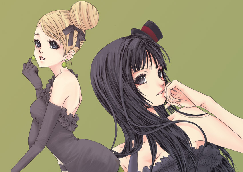 00s2girlsbare shouldersblack eyesblack hairblonde hairdressearringselbow glovesfrillsgloveshair bunhair ribbonhair uphatjewelrylong hairmini hatmini top hatmultiple girlsribbonsimple backgroundsingle hair buntop hat