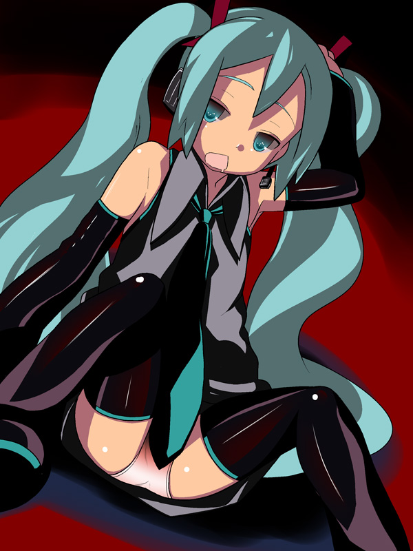 aqua eyesaqua hairdetached sleevesheadphonesheadsetlong hairnecktieopen mouthpantiespantyshotskirtsleepysolothighhighstwintailsunderwearyawning