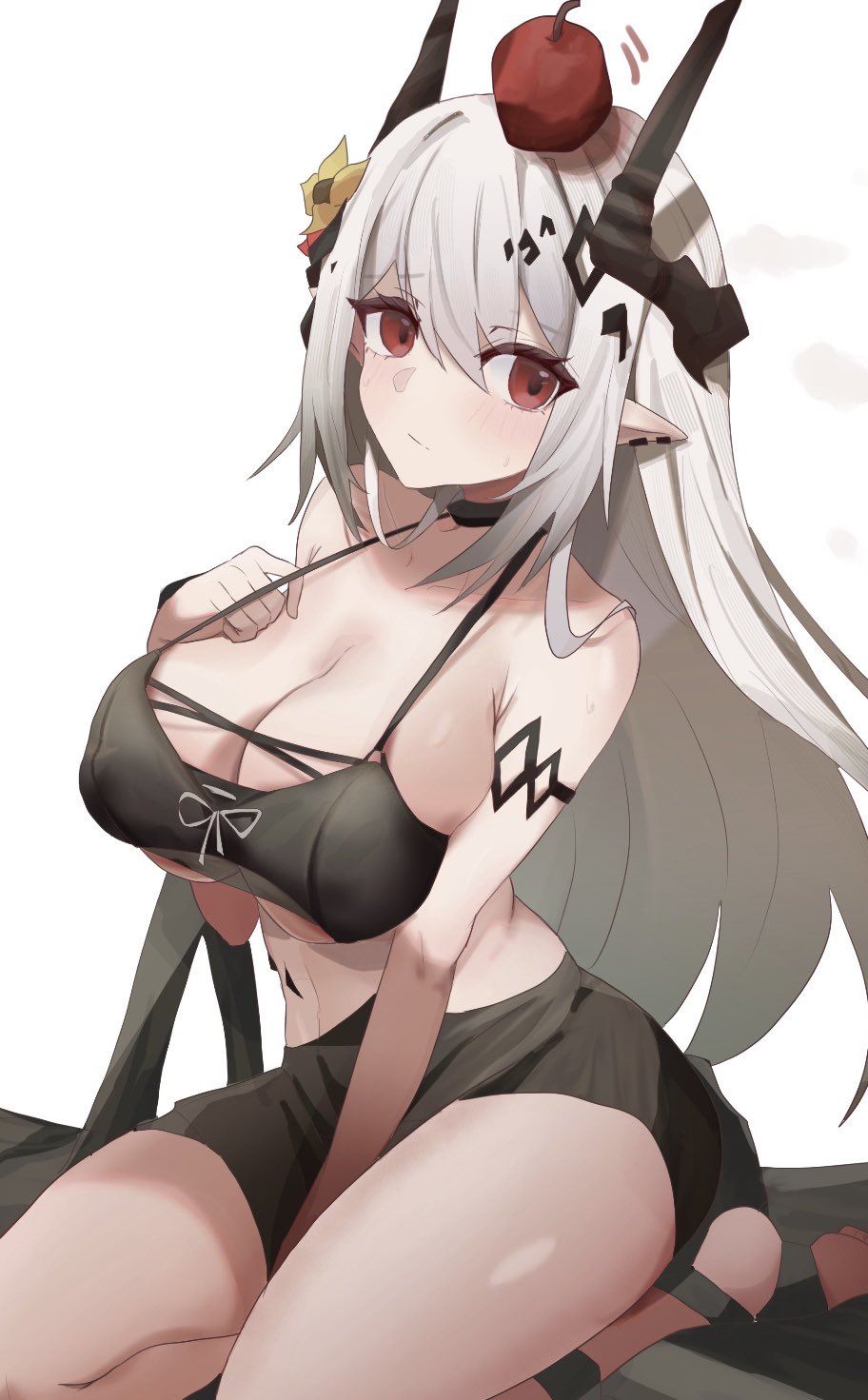 1girlapplebikiniblack bikiniblack hornsblack sarongbreastscleavageclosed mouthear piercingfoodfruitgrey hairhair between eyeshornslarge breastslong hairlooking at viewermaterial growthofficial alternate costumeoripathy lesion (arknights)piercingpointy earsred eyessarongsimple backgroundsittingsoloswimsuitwhite background