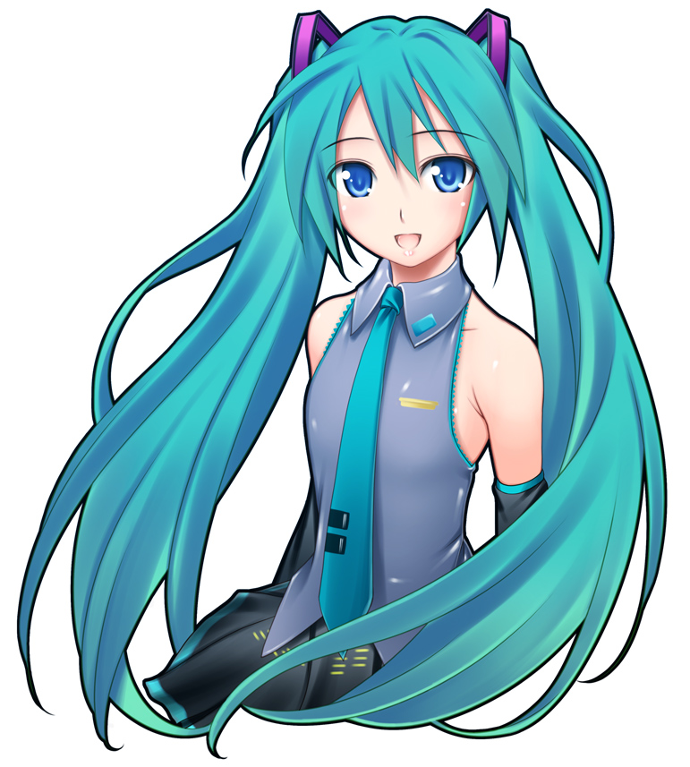 aqua eyesaqua hairbare shouldersblue eyesblue hairdetached sleevesflat chestlong hairnecktiesimple backgroundskirtsolotwintailsvery long hair