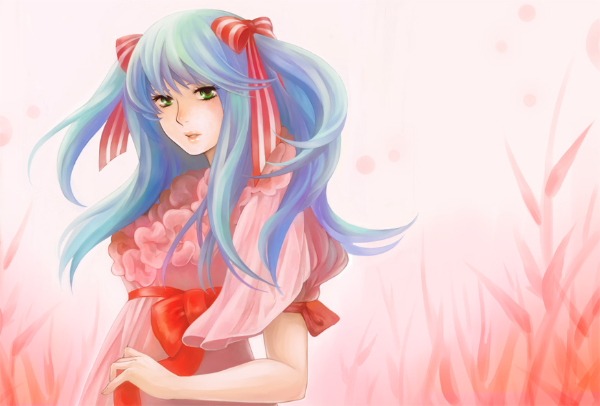 1girlblue hairblushbowdressfemale focusgreen eyeshair ribbonlipslong hairlooking at viewerpink dresspuffy sleevesribbonshort sleevessolotwintails