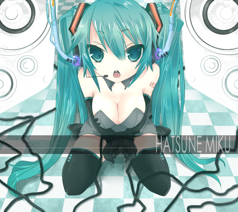 1girlaqua eyesaqua hairbdsmbondageboundbound wristsbreastscleavageelbow glovesfemale focusglovesheadphonesheadsetlarge breastslong hairsolothighhighstwintails