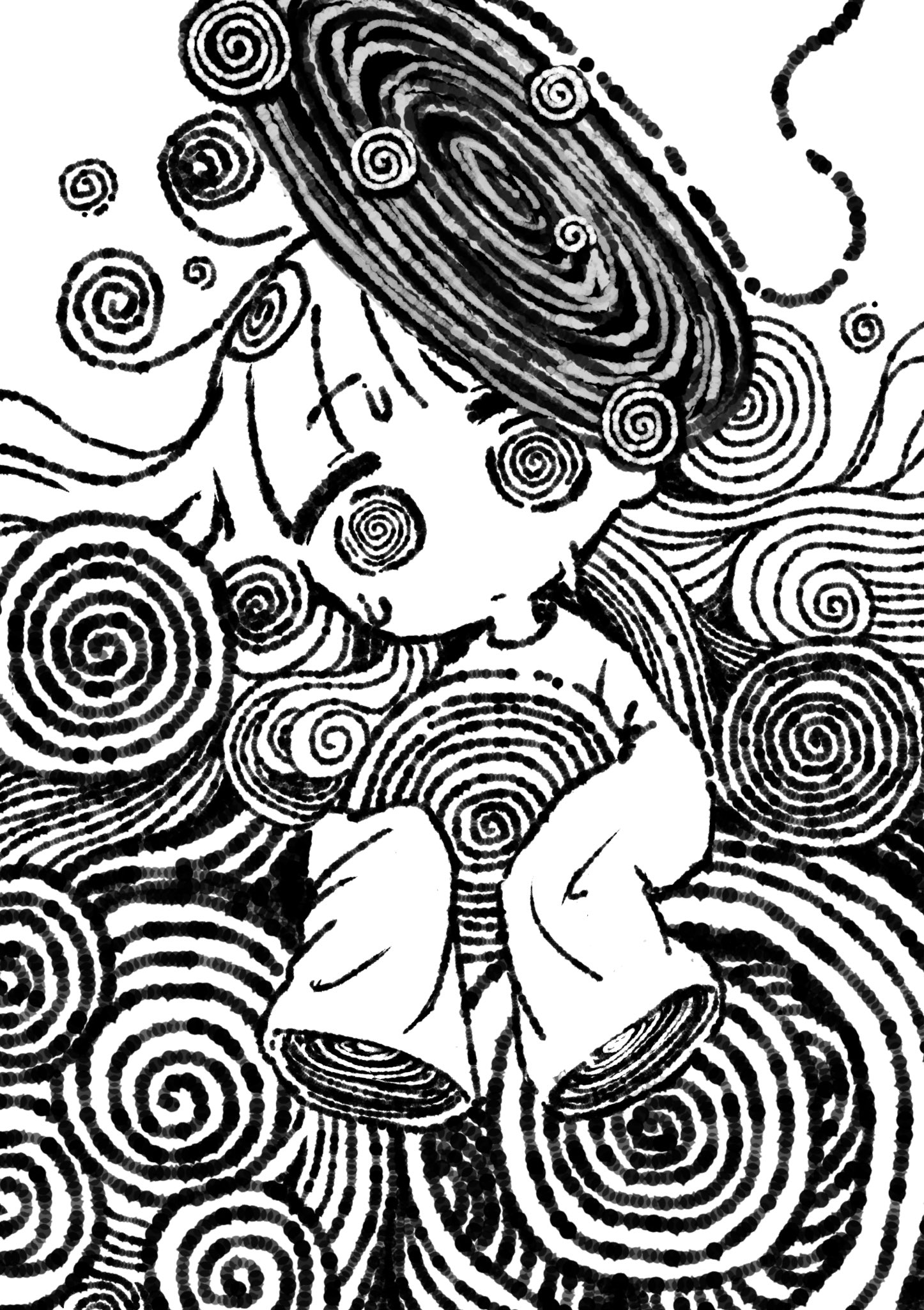1boy1girlexpressionlessgreyscalehead tiltholdinglong hairlong sleevesmonochromesleeves past fingerssleeves past wristssolospiralsweat