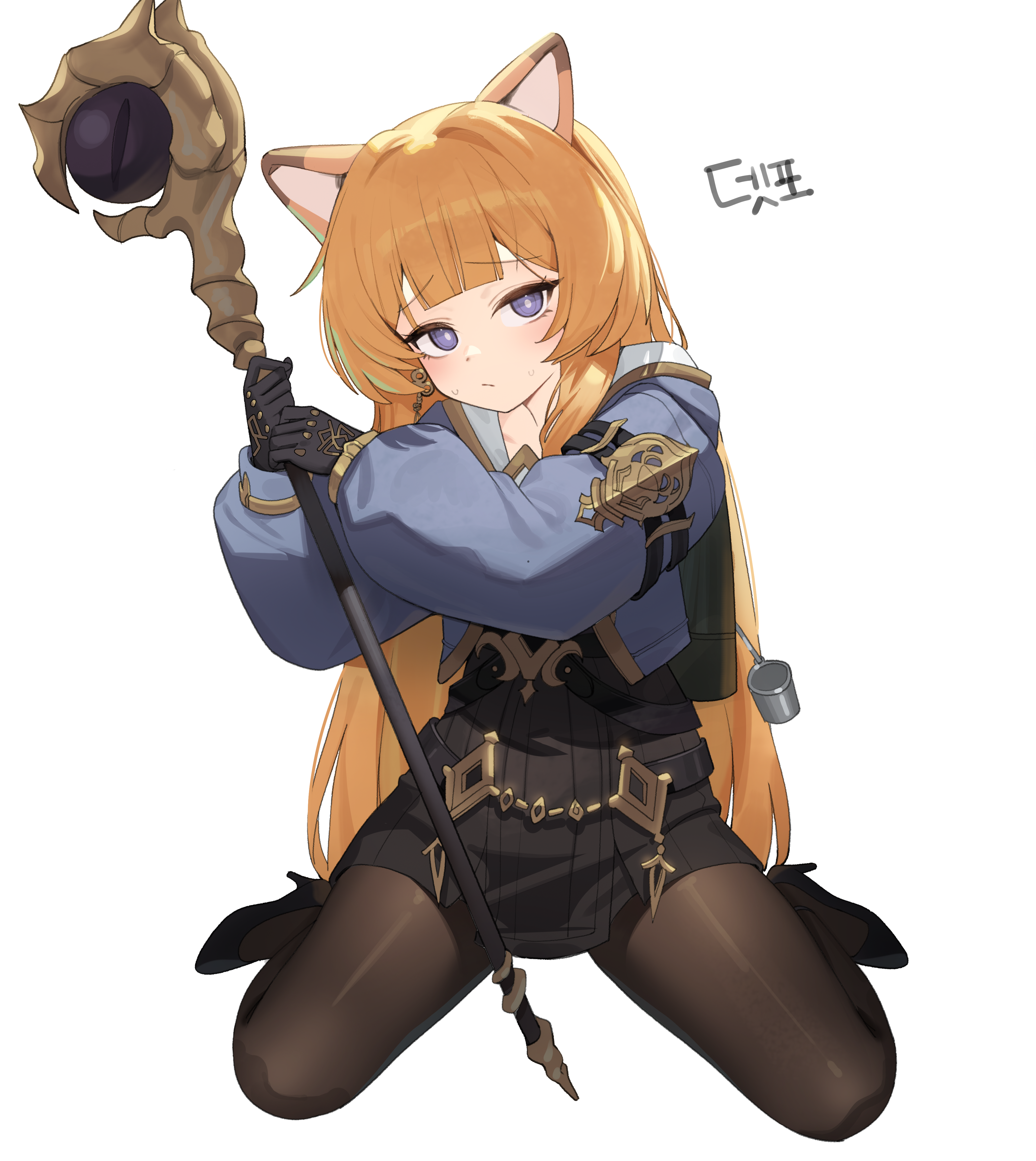 1girlanimal earsblack glovesblack skirtblonde hairblue shirtbrown thighhighsclosed mouthfrowngloveshigh heelsholdingholding stafflong hairlong sleeveslooking at viewerpleated skirtpuffy long sleevespuffy sleevespurple eyesshirtsimple backgroundsittingskirtsolostaffthighhighsvery long hairwarizawhite background