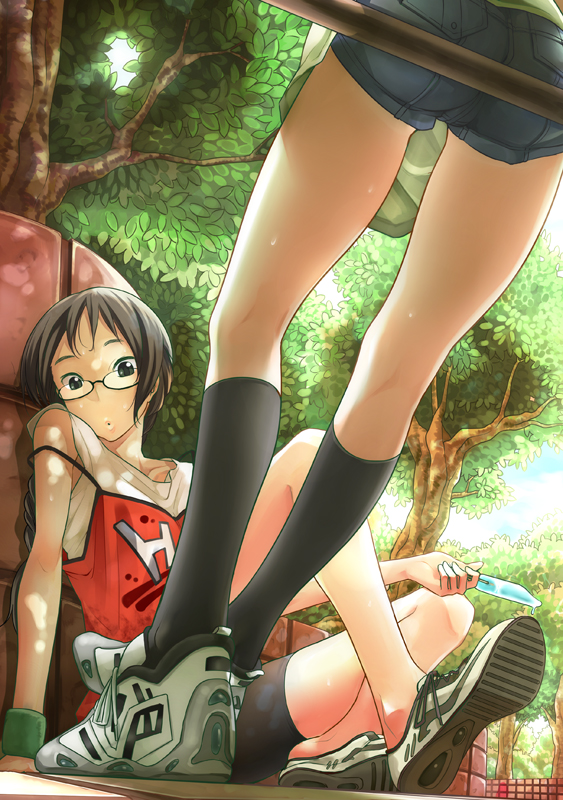 :o2girlsbare shouldersblack socksfoodglasseskneehighskneepitslegsmultiple girlsno sockspopsicleshoesshort hairshortssneakerssocksstrap slipsweattree