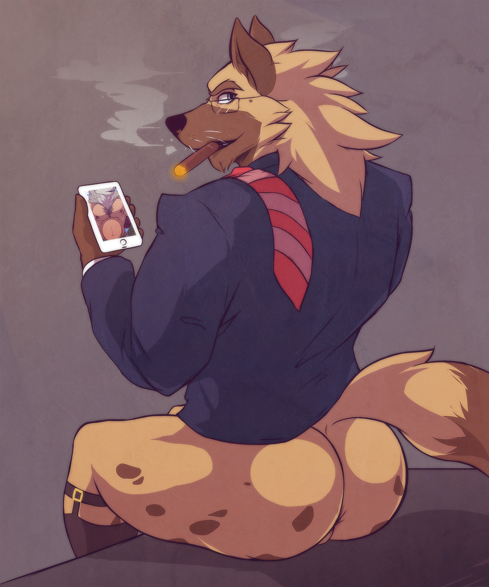anusassbottomlesscellphonecigarclothedclothingeyewearFlag for Deletionfurglasseshalf-dressedhyenalooking at viewerlooking backmalemale onlymammalphoneseatedsmokingsolo