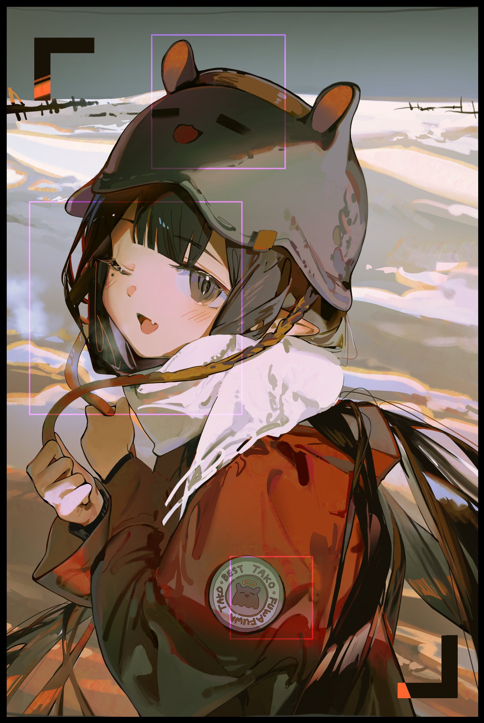 1girlblunt bangsbrown eyescoatfanghatlong hairlooking at viewerparted lipspurple hairred coatscarfskin fangsmilesnowstraight hairviewfinderwhite scarf