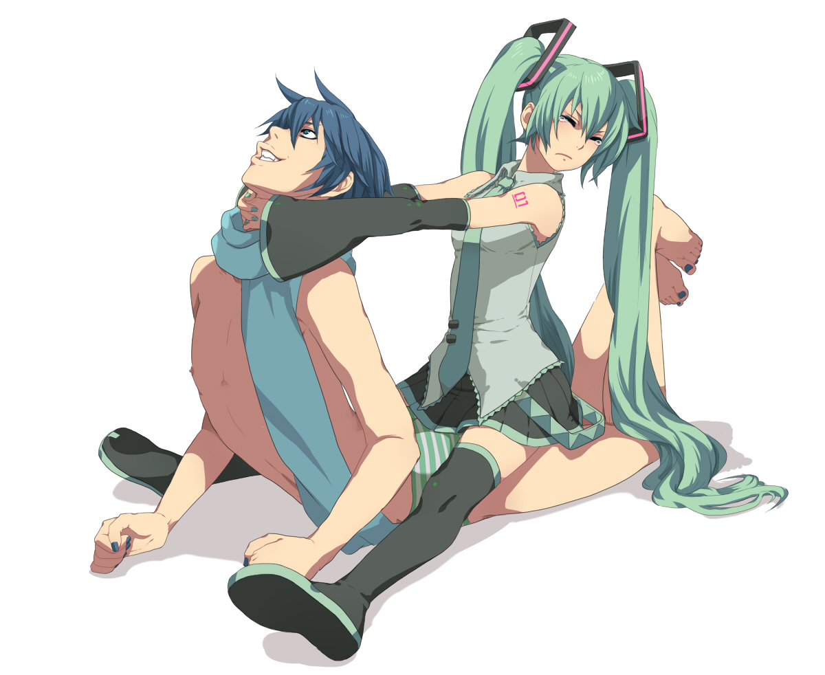 1boy1girlaqua hairbarefootbdsmblue eyesblue hairblue scarfblushborrowed clothesclosed eyesdetached sleevesgirl on toplong hairlyingnecktieon stomachpantiesscarfshort hairsimple backgroundsittingskirtsmilestranglingstriped clothesstriped pantiestearsthighhighstwintailsunderwearunderwear onlyzettai ryouiki
