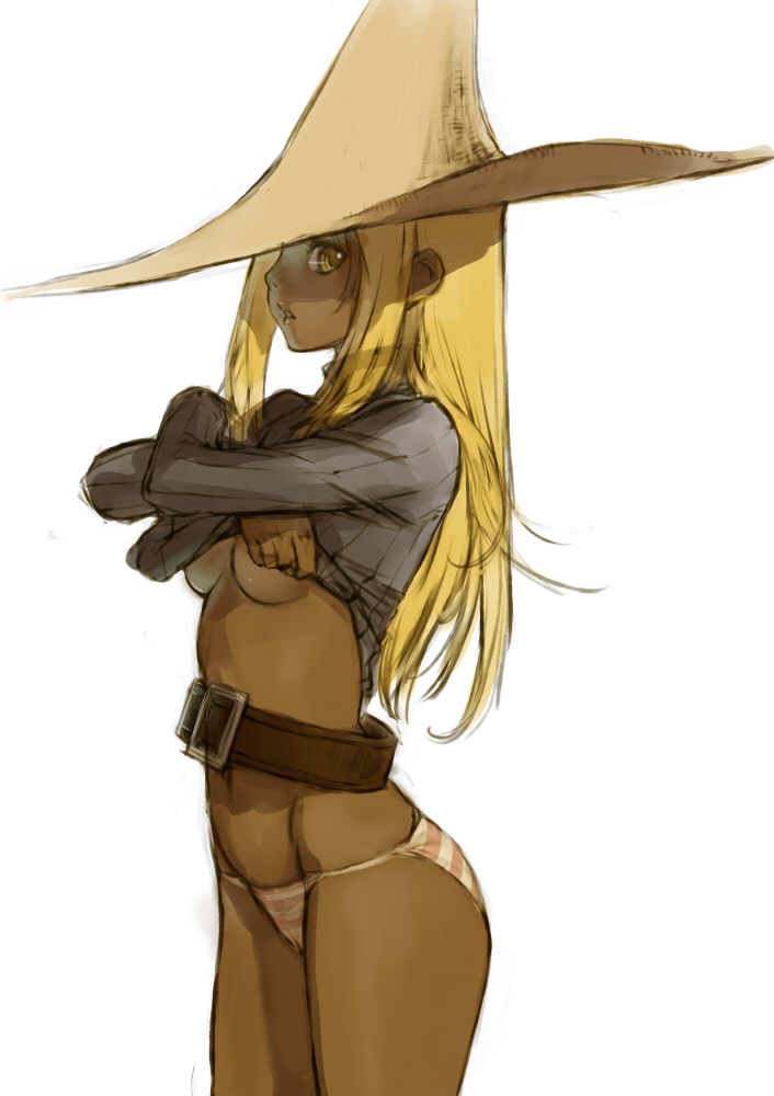 1girlbeltblonde hairbreastsdark skindark-skinned femalefemale focushathumelong hairpantiesprofilesimple backgroundsketchsolostriped clothesstriped pantiesunderboobunderwearundressingyellow eyes