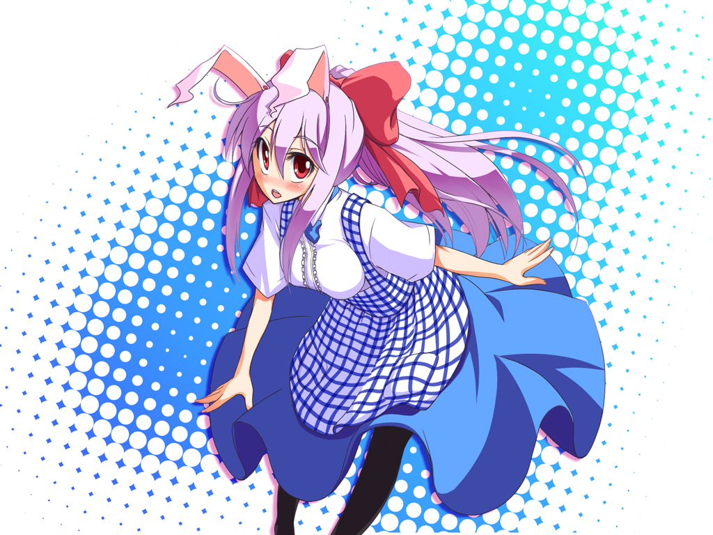 1girlalternate hairstyleanimal earsapronblouseblue backgroundblue bowblue bowtieblue themeblushbowbowtiecenter frillsfemale focusfrillsgingham apronkobeya uniformpantyhoseplaid apronplaid clothesponytailpurple hairrabbit earsred eyesribbonshirtsolowaitresswhite backgroundwhite shirt