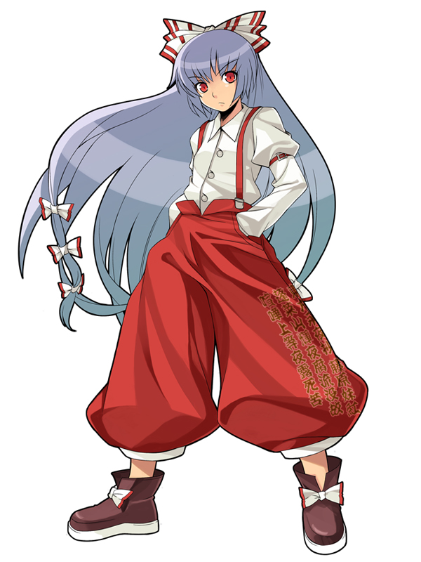 1girlfemale focusfull bodyhair ribbonlong hairpantsred eyesribbonsimple backgroundsolosuspenderswhite background