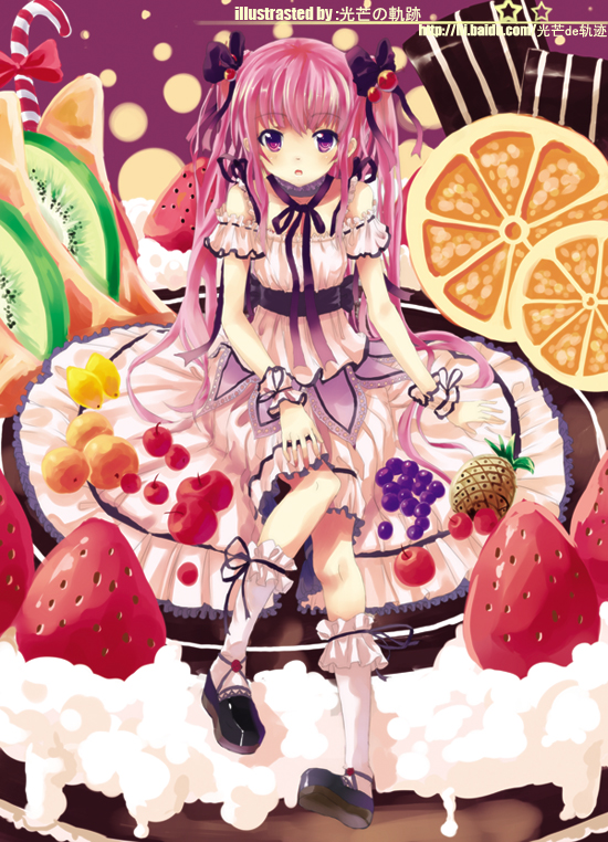 1girlapplebowcakecandycandy canedressfemale focusfoodfruitgrapeskiwi (fruit)orange (fruit)pastrypineapplepink eyespink hairribbonsittingsolostrawberrytwintailswrist cuffs