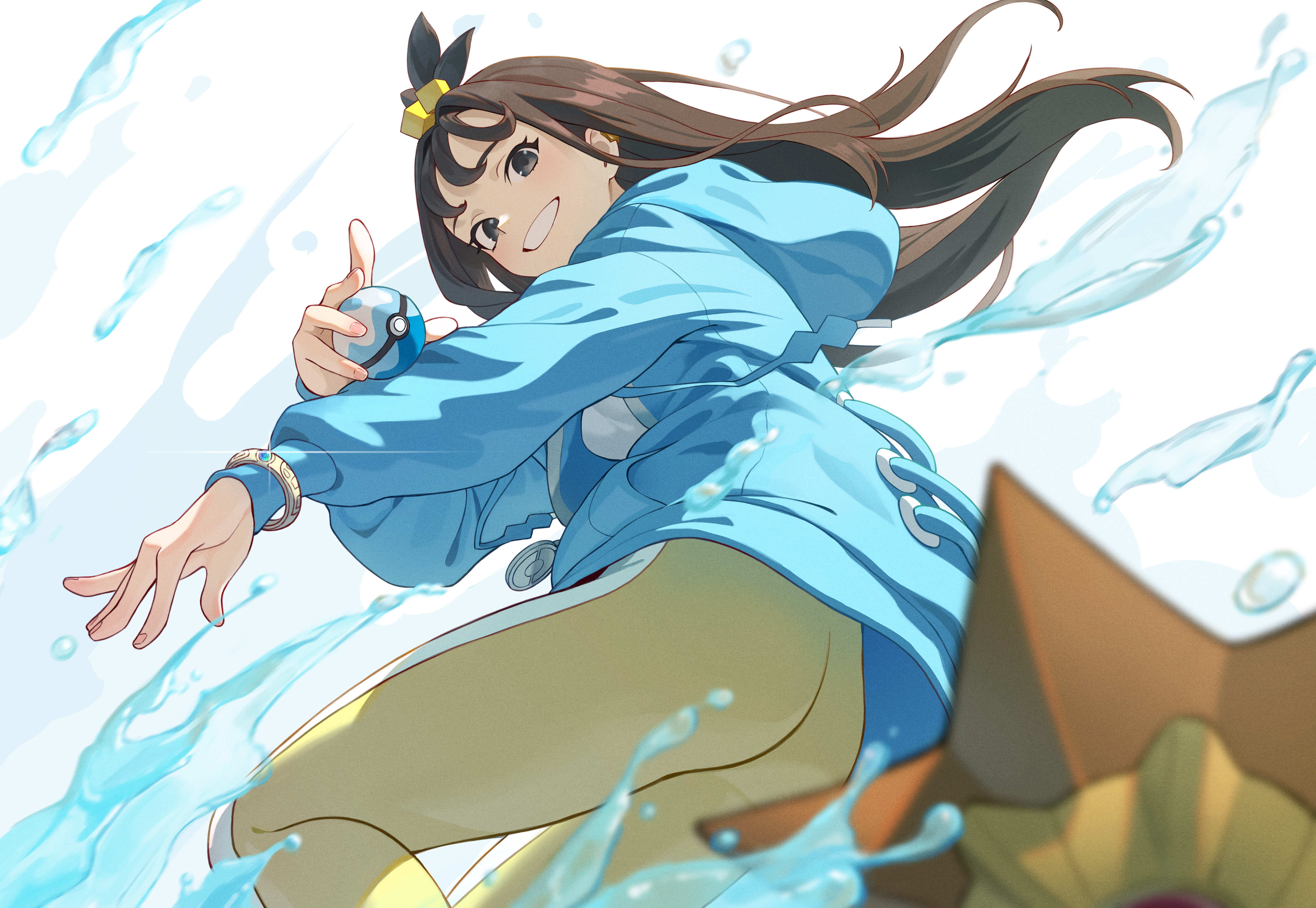 1girlassblue hoodiebraceletbrown haircube hair ornamentdive balleyelashesgen 1 pokemongrinhair ornamenthappyholdingholding poke ballhoodhood downhoodiejewelryleggingslong hairpoke ballpokemon (creature)sidelockssmileteethtopknotwaterwater dropwhite background
