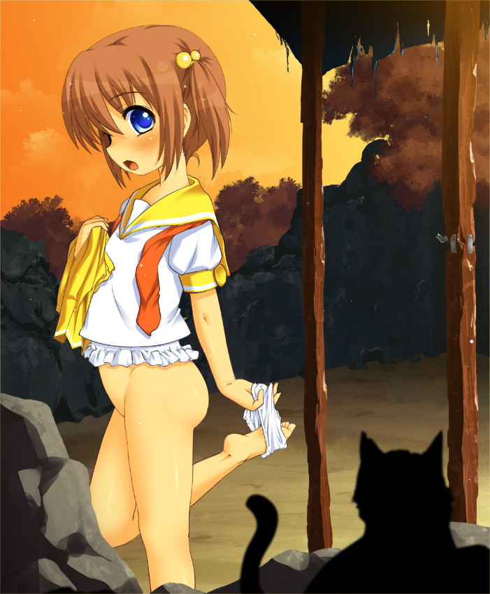 1girlassbarefootblue eyesblushbottomlessbrown haircatfeetfemale focusflat chestlolino pantiespantiespanty pullsolostandingstanding on one legtwintailsunderwearundressingunworn clothes