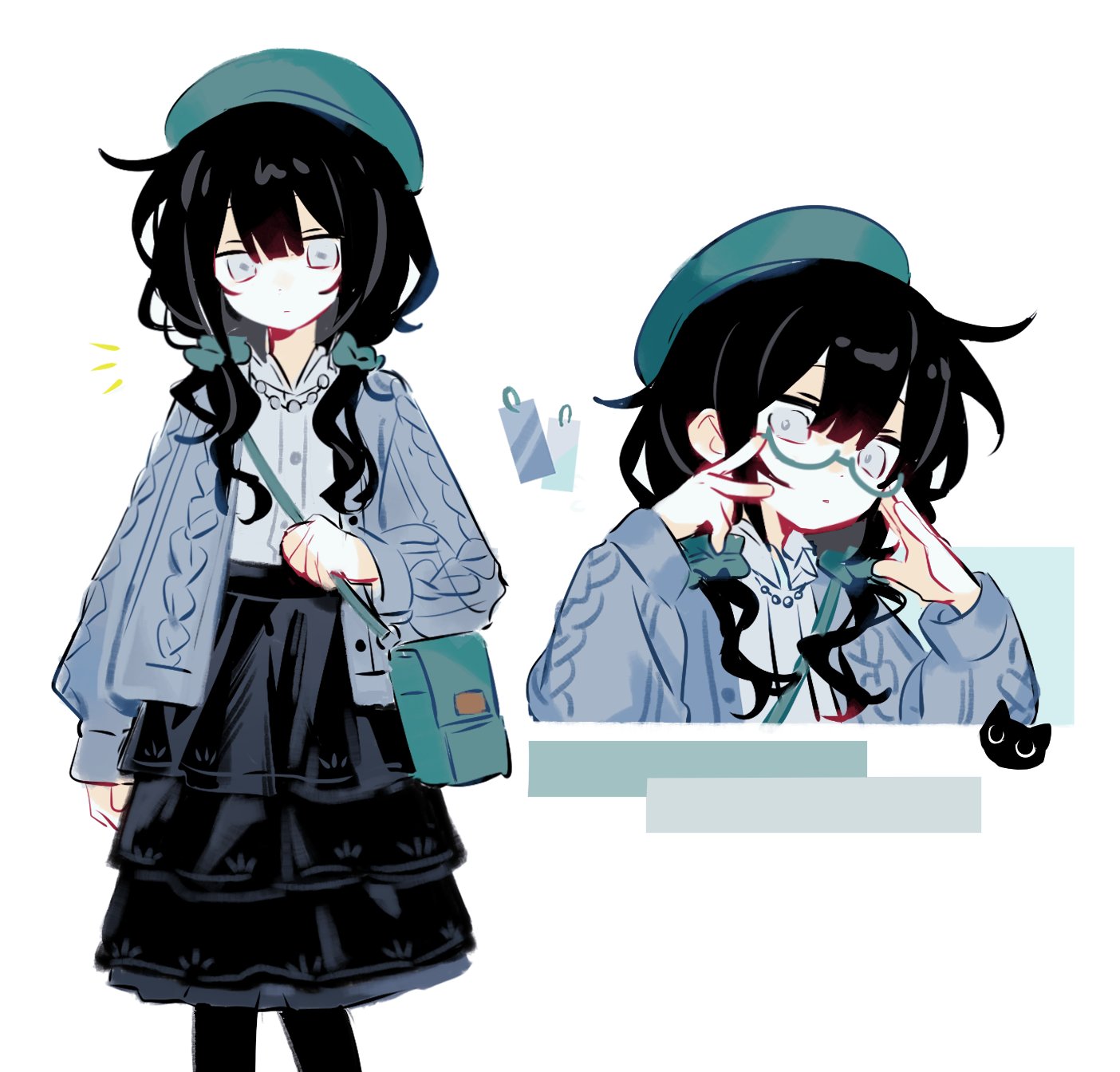1girlberetbespectacledblack hairblack skirtcardiganclosed mouthfeet out of frameglassesgreen baggreen hatgrey cardigangrey eyeshands on eyewearhands uphatlayered skirtlong hairlong sleeveslooking at viewermultiple viewsnotice linesofficial alternate costumeofficial alternate hairstylepantyhosesemi-rimless eyewearshirtskirtstandingtwintailsupper bodywhite backgroundwhite shirt