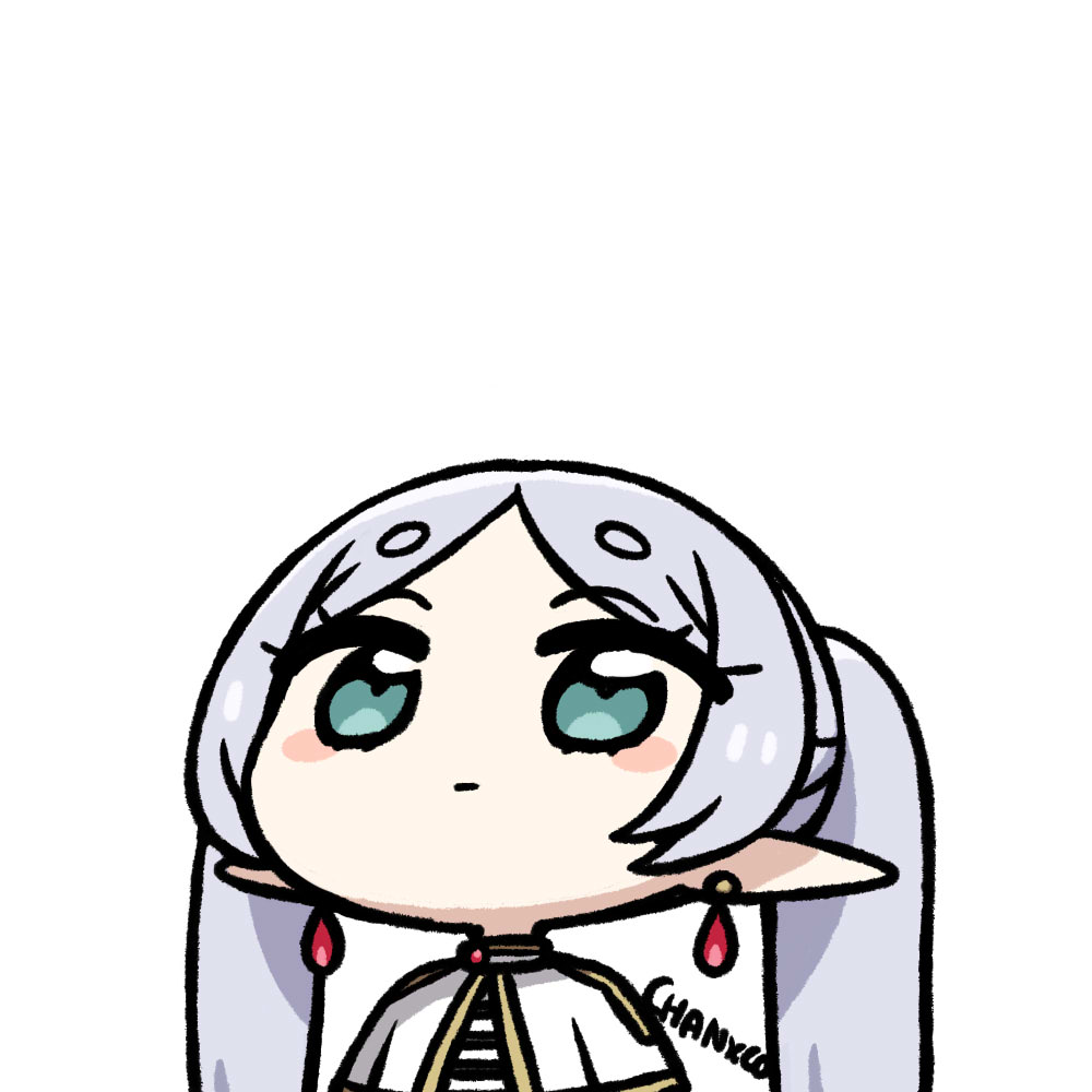 1girlblue eyesblushcapeletchibichibi onlyclosed mouthearringselfgrey hairhair between eyesjewelrylong hairmemepointy earssignaturesimple backgroundsoloteardrop earringstwintailsupper bodyupward angle frieren drawing (meme)white backgroundwhite capelet