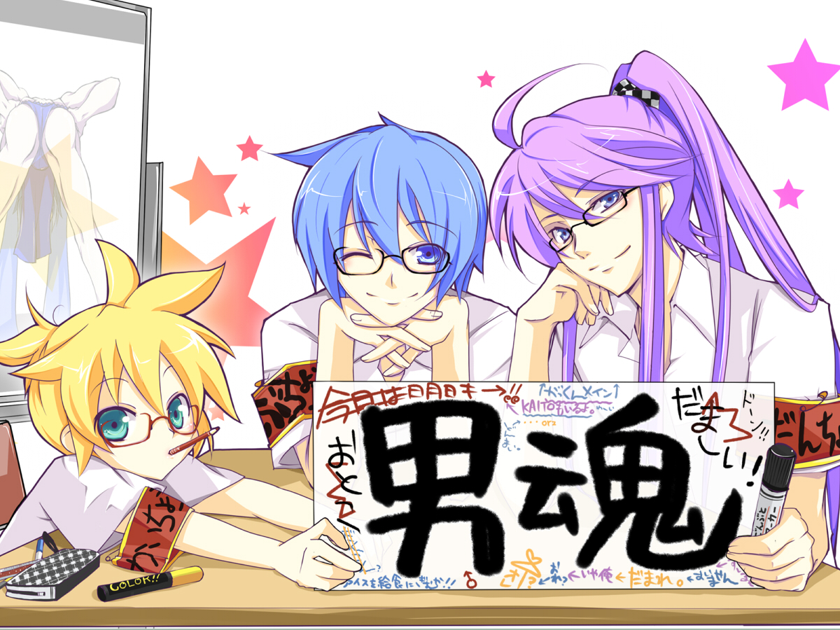 3boysaqua eyesblonde hairblue eyesblue hairfundoshiglassesmale focusmultiple boysone eye closedpencilpurple hairsmilewinkwooden pencil