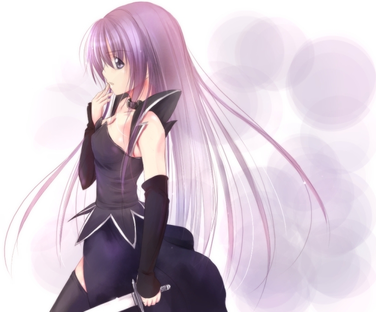 1girlbreastschokercleavagecorsetdemon girlelbow glovesfemale focusgloveslarge breastslong hairprofilepurple eyespurple hairsoloswordthighhighsweapon