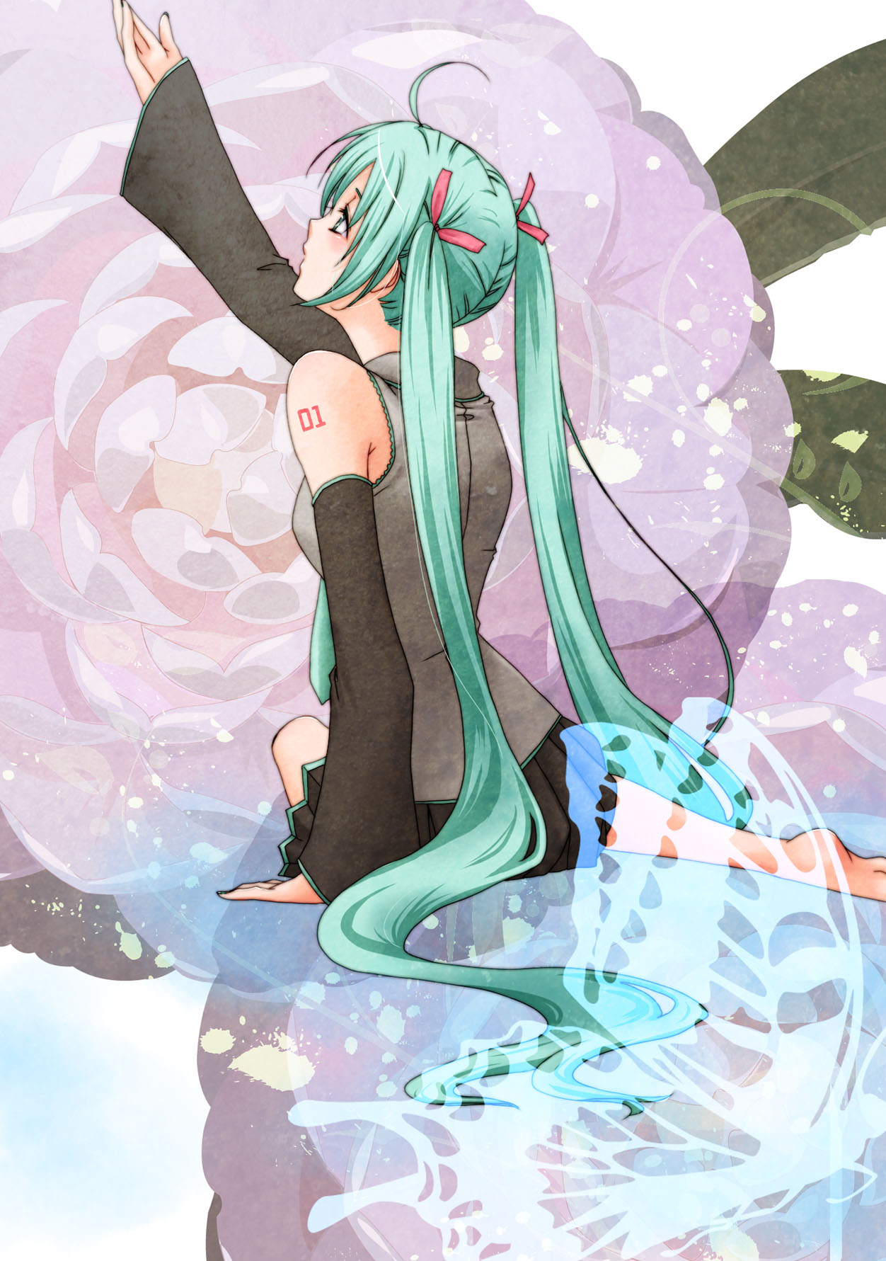 1girlahogeaqua eyesaqua hairbarefootdetached sleevesfemale focusflowerhair ribbonlong hairribbonrosesittingskirtsolotwintailsvery long hair