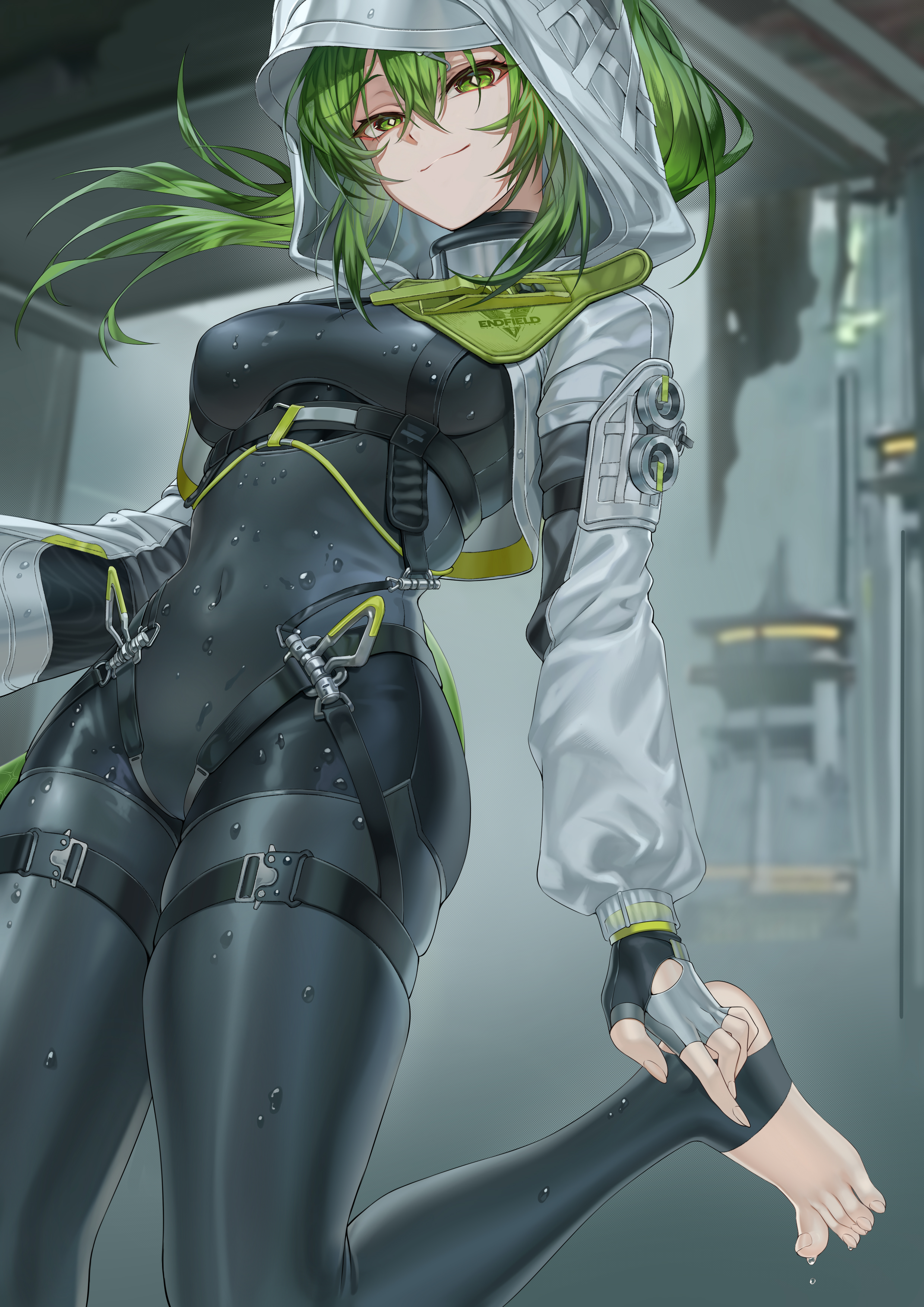 1girlblack bodysuitblack glovesbodysuitbreastsclosed mouthcovered navelendfield industries logofeetfeet out of framefingerless glovesfingernailsfluorite (arknights)glovesgreen eyesgreen hairhair between eyeshair through hoodhoodhooded shrugimpossible bodysuitimpossible clothesleg uplong fingernailslong hairlong sleeveslooking at viewermedium breastsmulticolored glovesno shoesshrug (clothing)snake tailsolotailthighstwo-tone gloveswater dropwetwet clotheswhite gloveswhite shrug