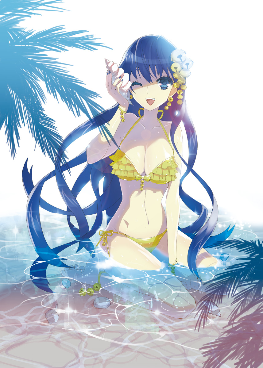 1girlbellbikiniblack hairblue eyesfemale focushair ornamentlong hairone eye closedseashellshellshell to earsmilesoloswimsuitvery long hairwaterwinkyellow bikini