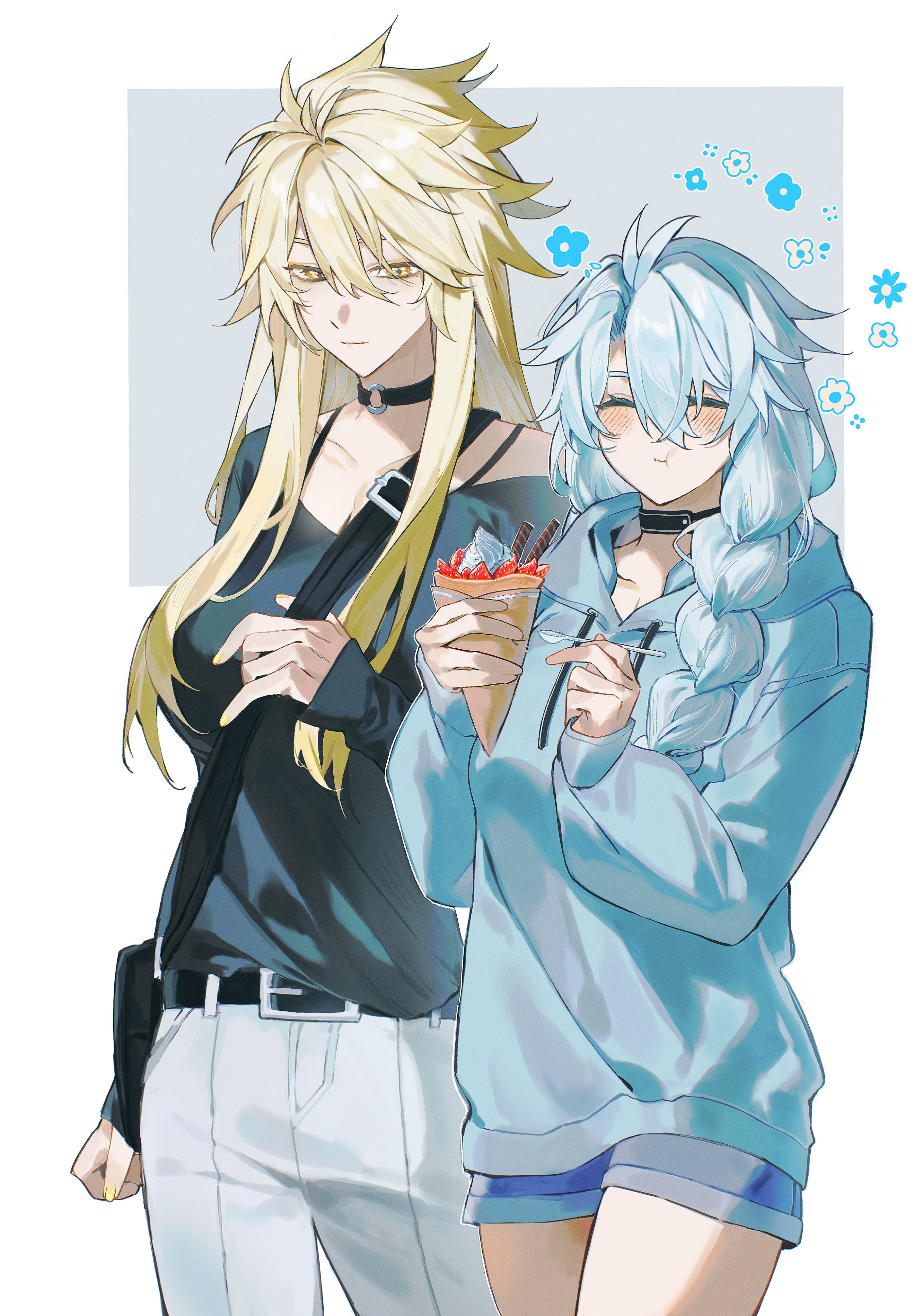 2girlsalternate costumeantenna hairbagbeltblonde hairblushbraidchokerclosed eyesflowerfoodgenderswapgenderswap (mtf)holdingholding foodholding spoonhoodhoodieiqjwyns1616multiple girlspantsshirtshort hairshortsshoulder bagsimple backgroundspiked hairspoonvery short hairwhite hairyellow eyes