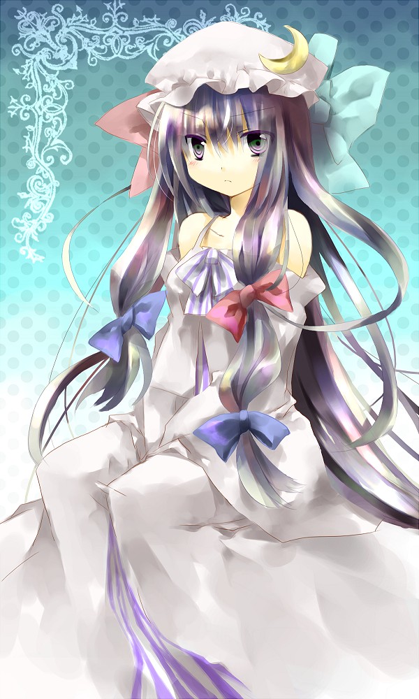 1girlbare shouldersbowcrescentfemale focushair ribbonhatlong hairpink bowpurple eyespurple hairribbonsittingsolo