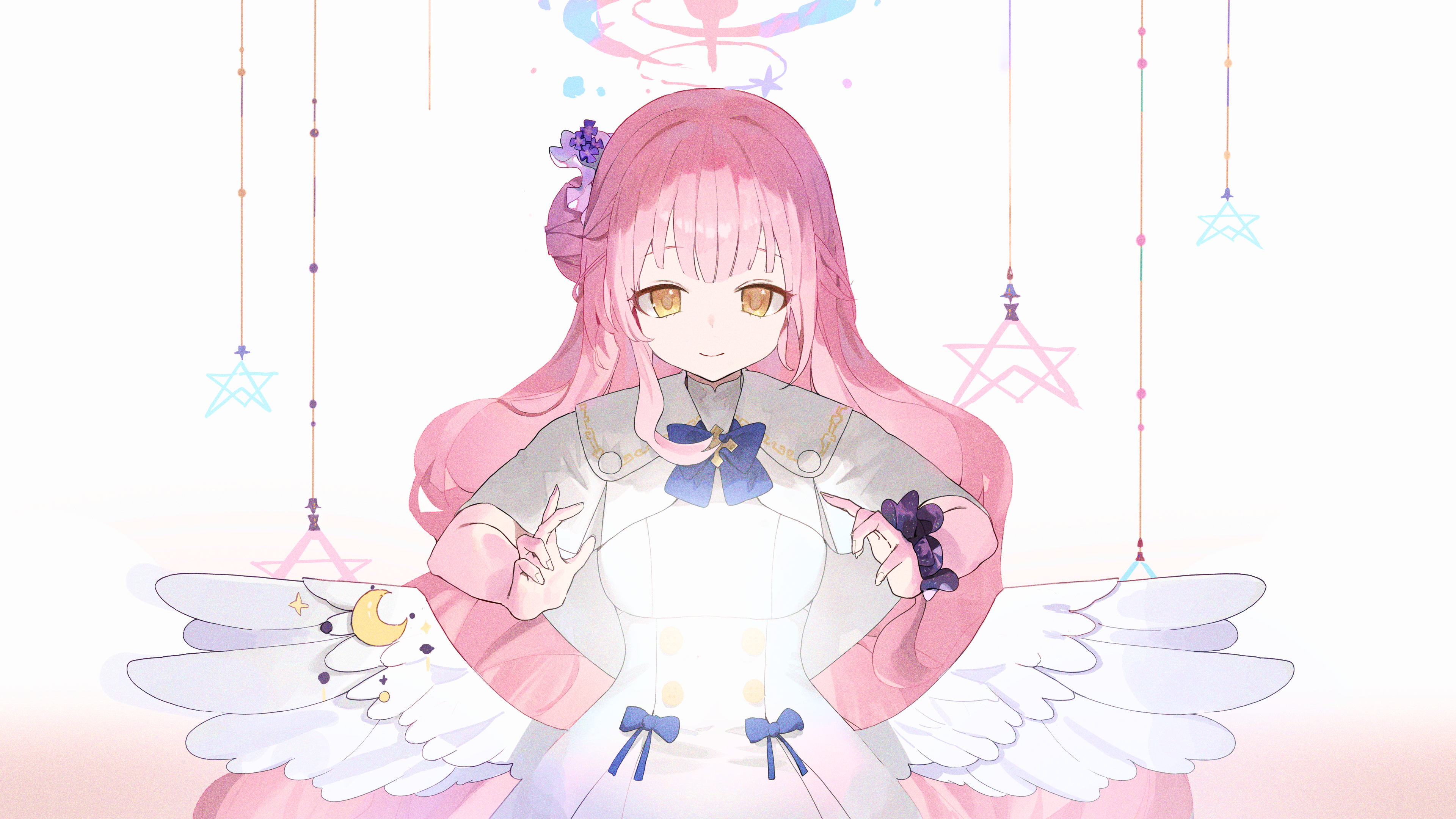 angel wingsaqua hairblue bowbowbreastsbuttonscapeletclosed mouthcrescentdouble-breasteddressebsuiioteflowergold trimgradient hairhair bunhair flowerhair ornamenthalohigh heelslow wingsmedium breastsmulticolored hairpink hairpink haloscrunchiesimple backgroundsingle hair bunsingle side bunsmilewhite backgroundwhite capeletwhite dresswhite wingswing ornamentwingswrist scrunchie