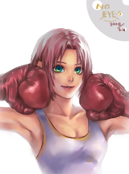 1girlarmpitsbare shouldersboxing glovesfemale focusgreen eyespink hairshort hairsmilesolotank top