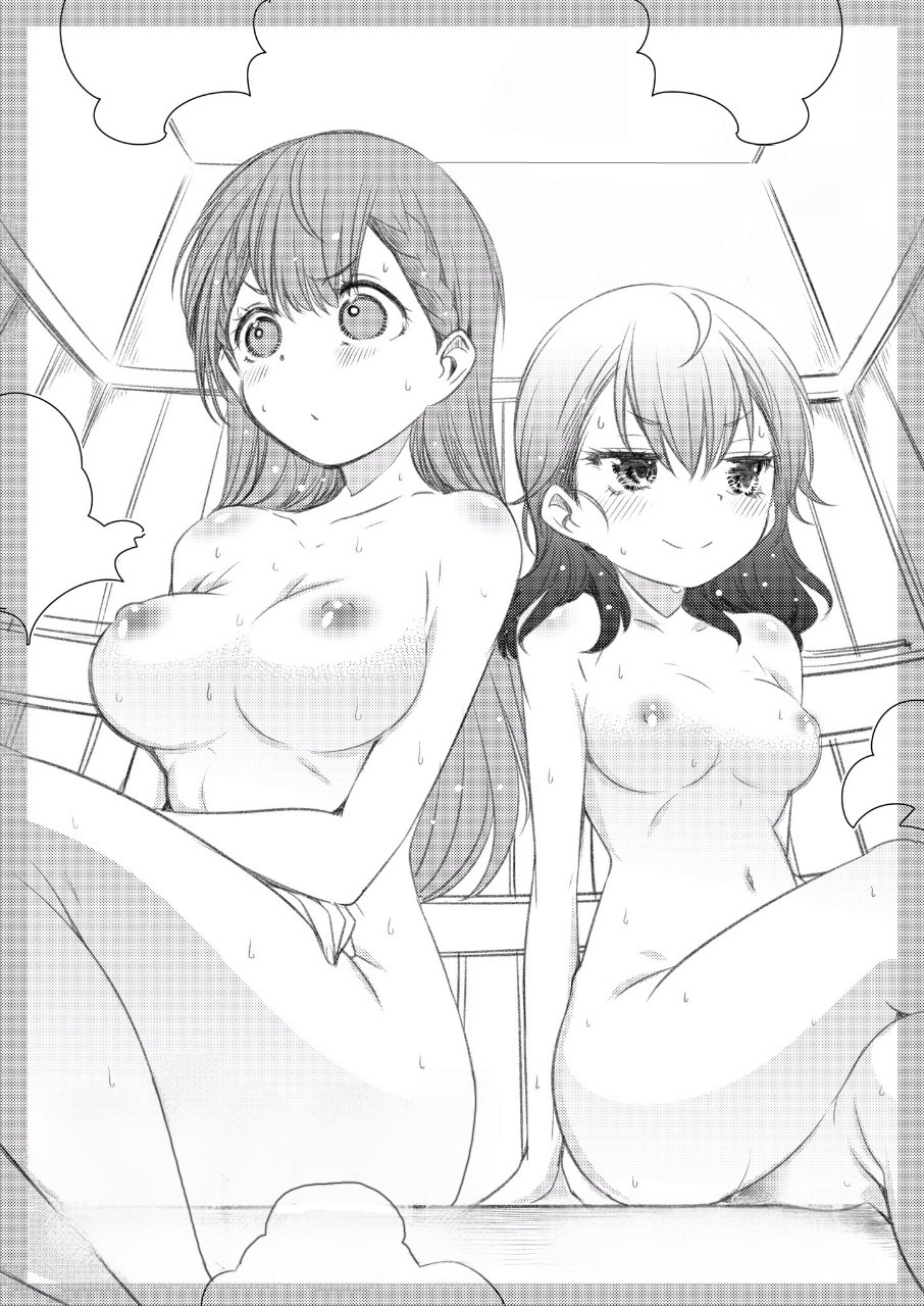 2girlsblushbraidbreastscleavagecollarbonecompletely nudecrossed armscrossed legsfemale focuslarge breastslong hairmonochromemultiple girlsnavelnipplesnudesaunasittingsmall breastssteamstomachthighs